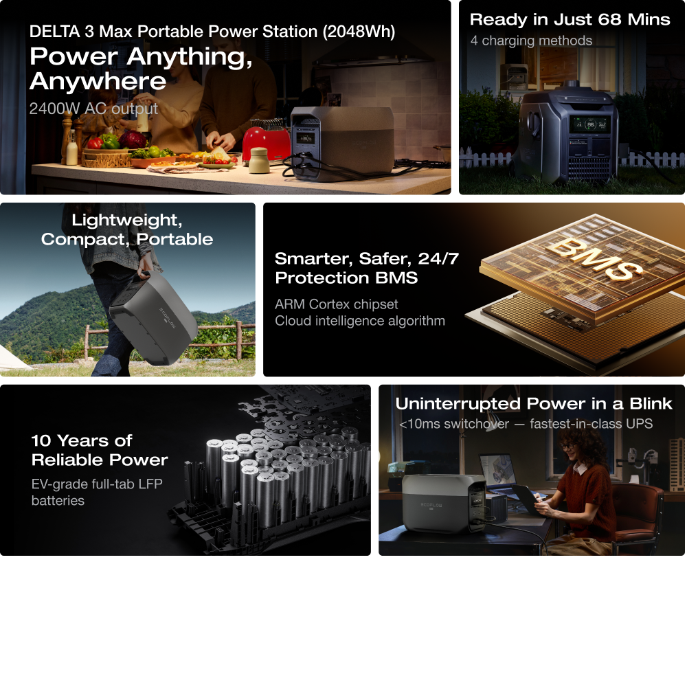 From battery chemistry to structural design, DELTA 3 Max (2048Wh) is engineered for extreme durability, environmental resilience, and whisper-quiet performance.