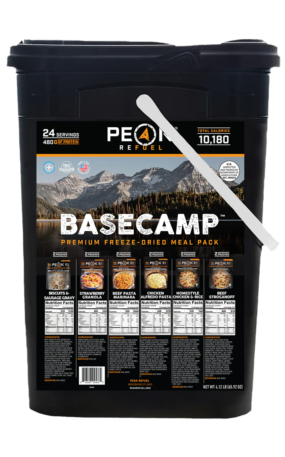 Marinara sauce (heavy cream [cream, carrageenan] tomatoes, parmesan cheese [pasteurized part-skim milk, cheese cultures, salt, enzymes], mozzarella cheese [pasteurized milk, cheese cultures, salt, enzymes], spices, garlic, onion powder), instant rotini (semolina, niacin, ferrous sulfate [iron], thiamine mononitrate, riboflavin, folic acid), cooked seasoned ground beef patty crumble (beef, less that 2% salt, natural flavors, grilled flavor [natural flavor (from sunflower oil), gum arabic], spices)