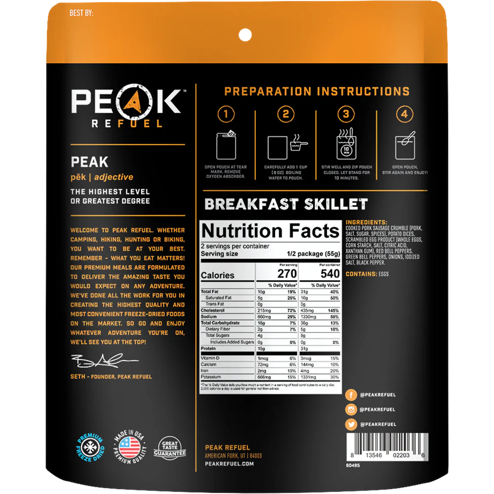 Alright, let’s be honest. If you’re really gonna push the boundaries, you need to start the day off with a meal that’ll support you. Peak Refuel’s Breakfast Skillet is a meal made for those who are ready to take on a challenge. With 31 grams of protein, you’ll be giving your body what it needs to get going. Just add 1 cup of water to this blend of whole eggs, peppers, and 100% real sausage for a breakfast made for thrill-seekers.