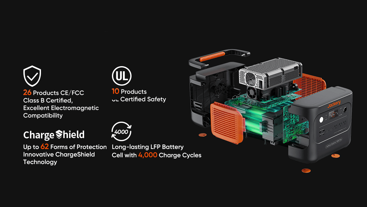 Boasting a durable 10-year lifespan with Lithium Iron Phosphate (LiFePO4) Battery, the Jackery 1000 Plus provides a constant voltage and pure sine wave, ensuring safety for all your electrical appliances. The innovative ChargeShield technology and stable power output also protect against potential equipment damage.