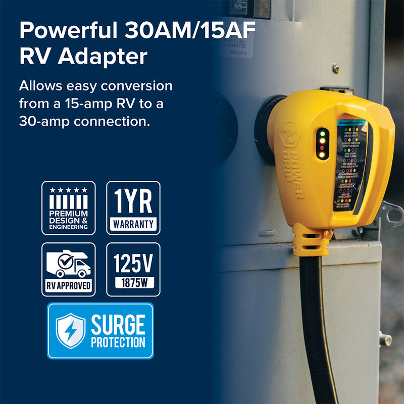 - Secure, efficient connection between your 50A RV outlet and 30A pedestal outlet