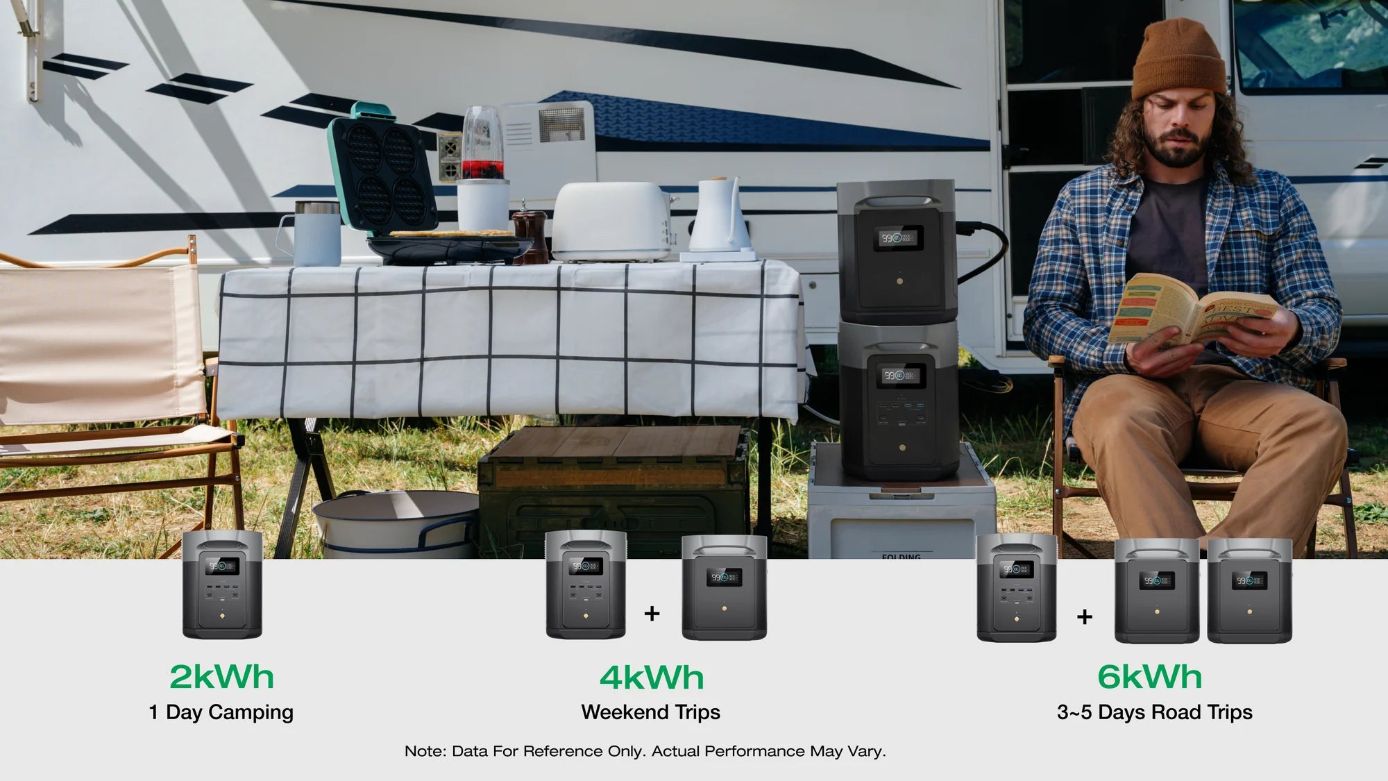 Extend runtime by connecting up to two EcoFlow DELTA 2 Max Extra Batteries, expanding total capacity to 6kWh—ideal for extended outages, RV trips, or off-grid applications.