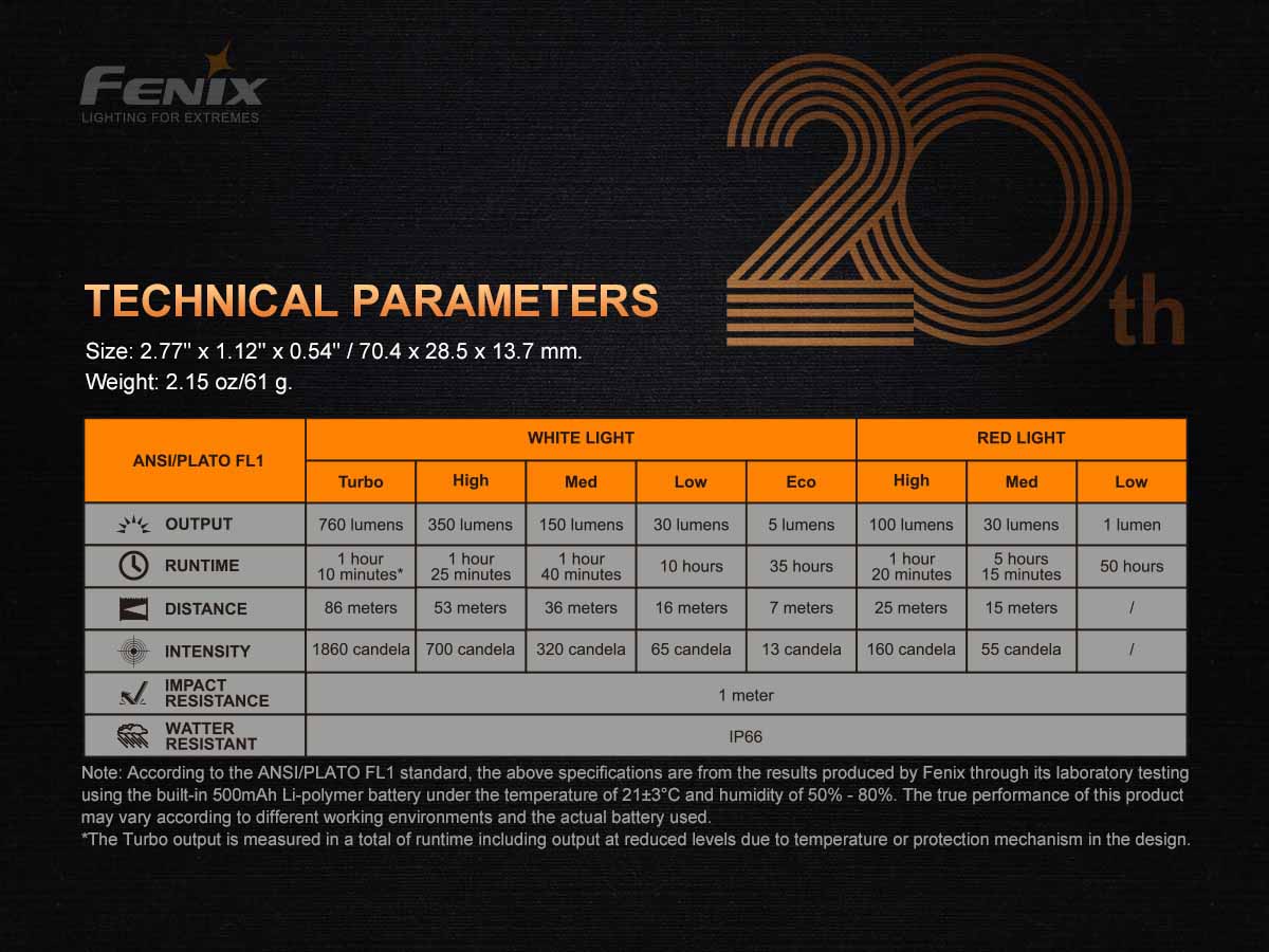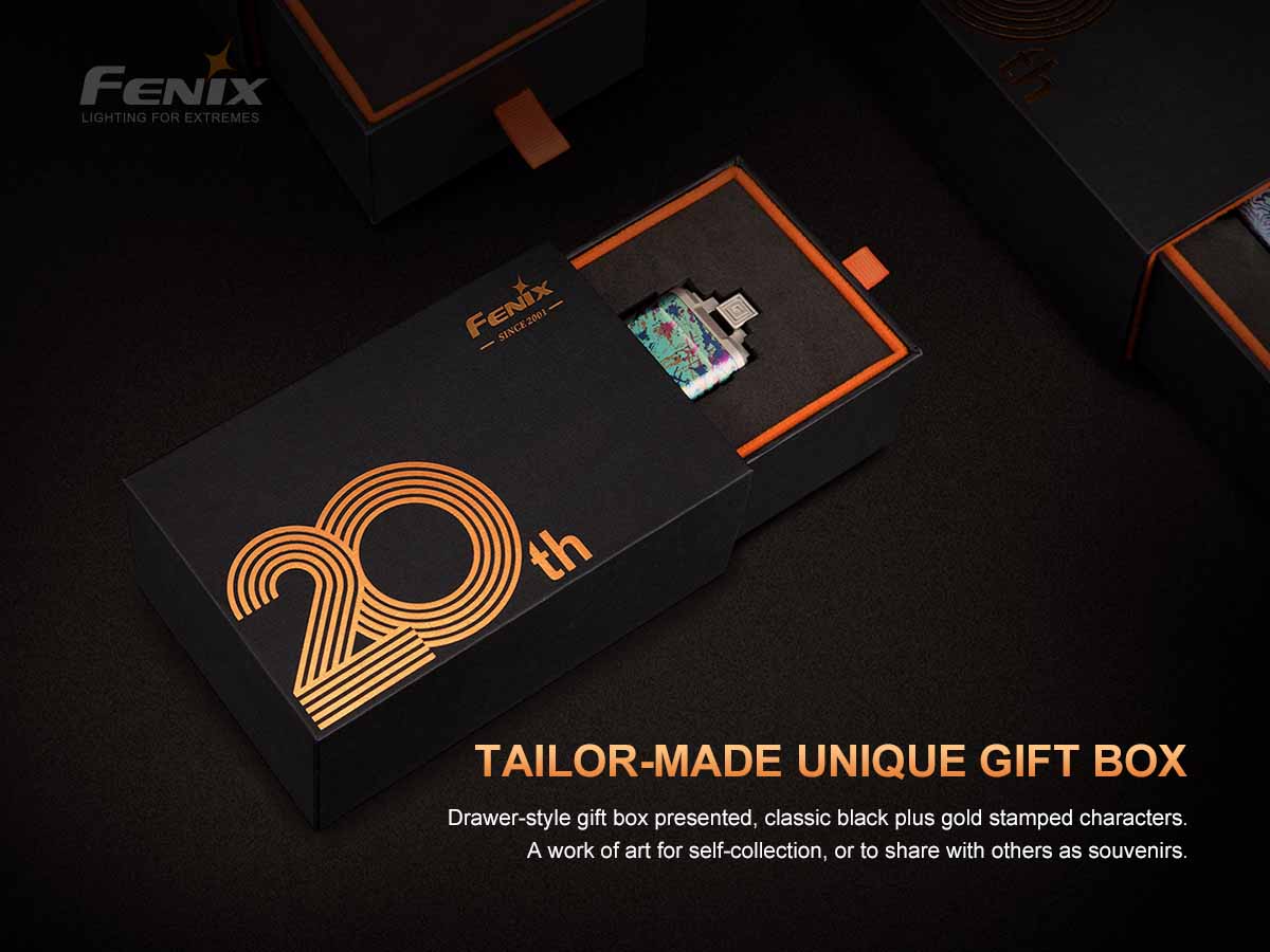 Fenix APEX 20 is the special limited edition flashlight for commemorating the 20th Anniversary of Fenix. This flashlight is limited to a total production run of 2500 units and is stamped with its number—making this flashlight a collector’s dream.