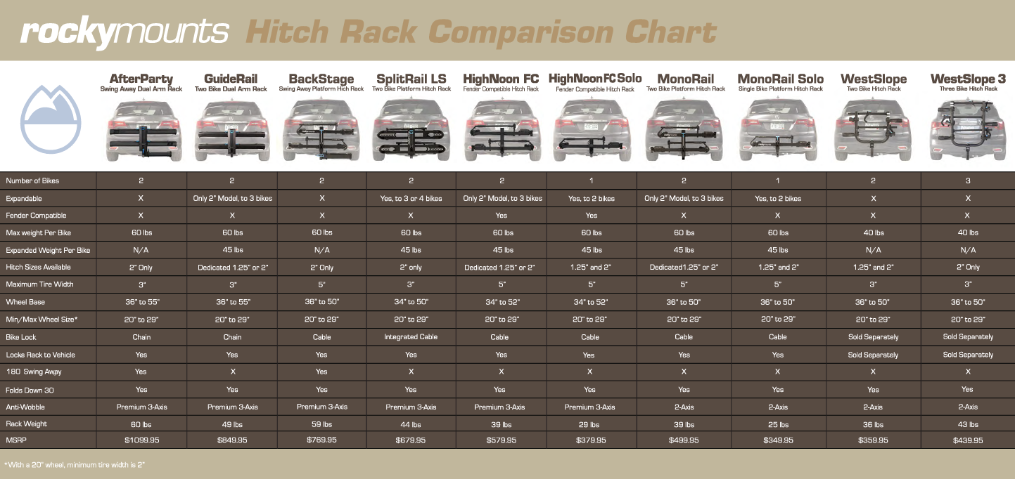 The GuideRail steps away from the traditional carrying style of platform hitch racks; By utilizing dual load arms, the rack completely eliminates frame or fork contact, it allows for asymmetric bike loading to avoid handlebar interference, and it creates a simple aesthetic that virtually blends in with most vehicles. The GuideRail reduces plastic parts to a minimum and maintains the same capacity and reliability of the MonoRail Family. Carrying bikes up to 60lbs per tray, tires up to 3” wide, and wheelbases up to 55” the GuideRail can handle just about anything including most E-bikes. Included is a 10mm square link chain to secure your bikes without stress.